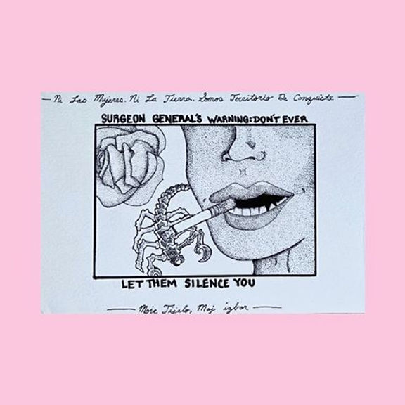 The second drawing is a play on a cigarette box/warning, I tried to draw images that converged my ideas of femininity and punk aesthetic. I co-opted the classic Surgeon General’s Warning of ‘smoking kills’ to instead warn against being silenced. Above the warning there is a phrase in Spanish which says “neither women nor the land are territories of conquest,” below there is a phrase in Croatian which says “my body my choice.”