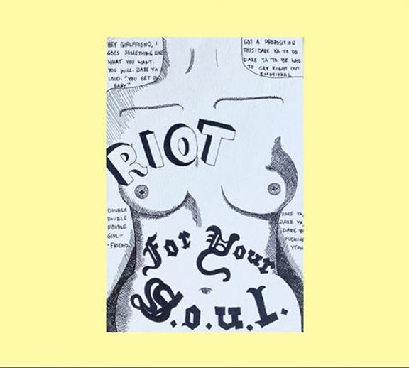 The first drawing I created was a drawing of a woman’s body with the words “Riot For Your Soul” tattooed on her stomach and the lyrics to Double Dare Ya by Bikini Kill in the background. I love tattoos and I strongly believe in the personal being political, to me it feels very punk to think of rioting as a spiritual practice as well as political.