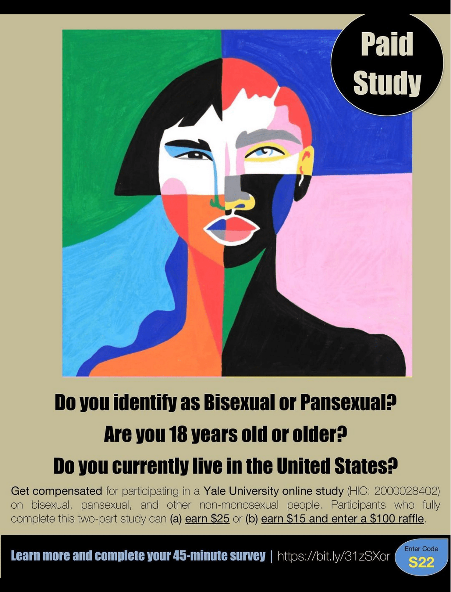 Participants must identify as bisexual and/or pansexual, be 18 years or older, and currently live in the United States. Participants will be compensated for this two-part online study and may earn either $25 OR earn $15 with the chance to enter a $100 raffle.